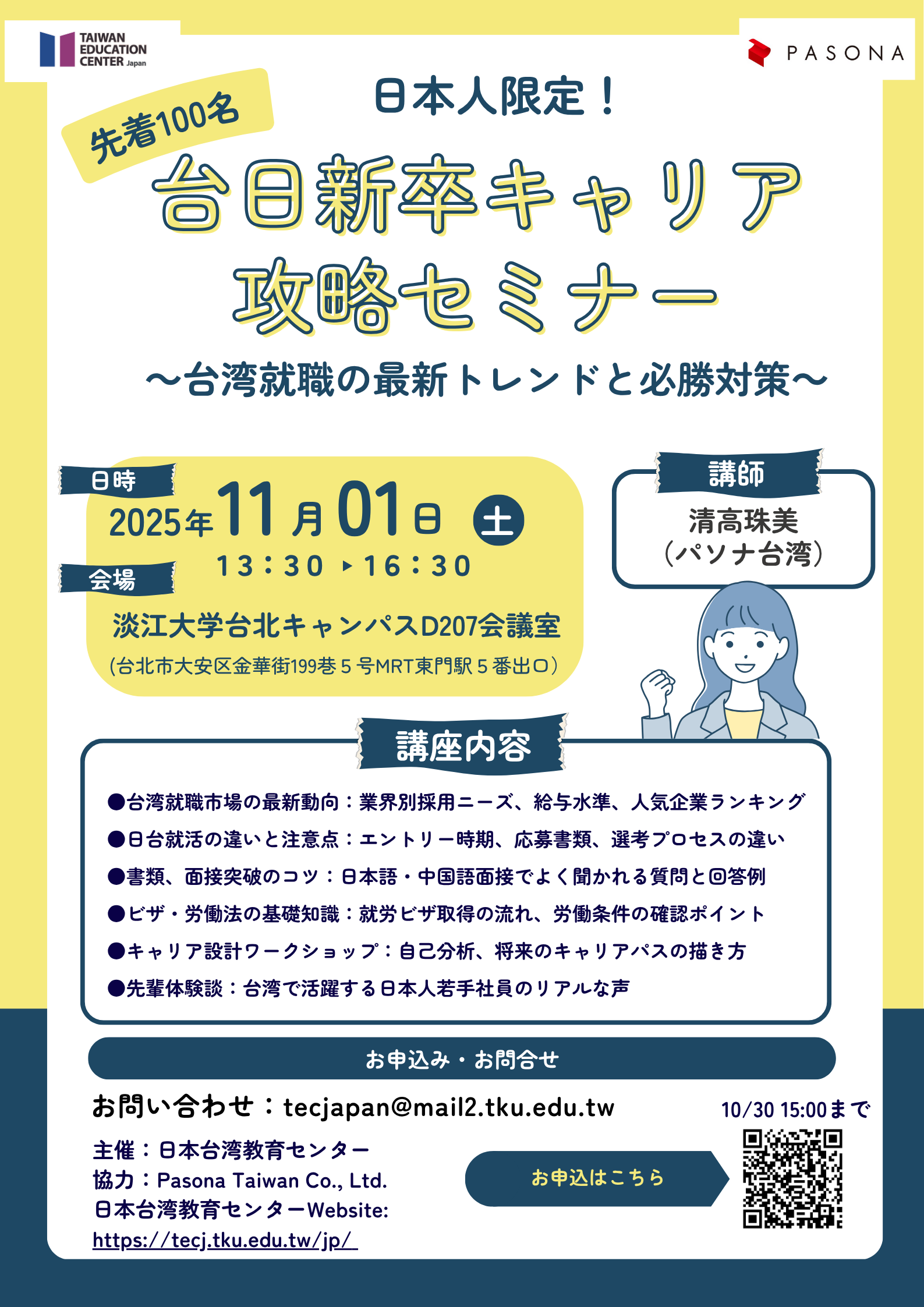 一、日本臺灣教育中心為服務在臺日本留學生,提供就業相關輔導與資訊,與日商公司合作辦理就業輔導講座,提供最新求職方式與須知。
