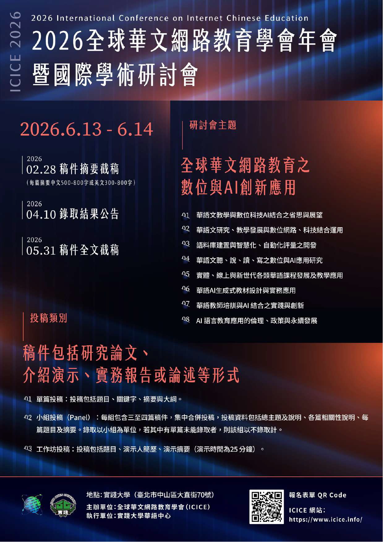 三、研討會廣邀國內外學者專家及實務工作者共同探討全球華文教育之數位轉型與人工智慧應用趨勢,徵稿內容涵蓋研究論文、介紹演示、實務報告或論述等形式,投稿類型如下: